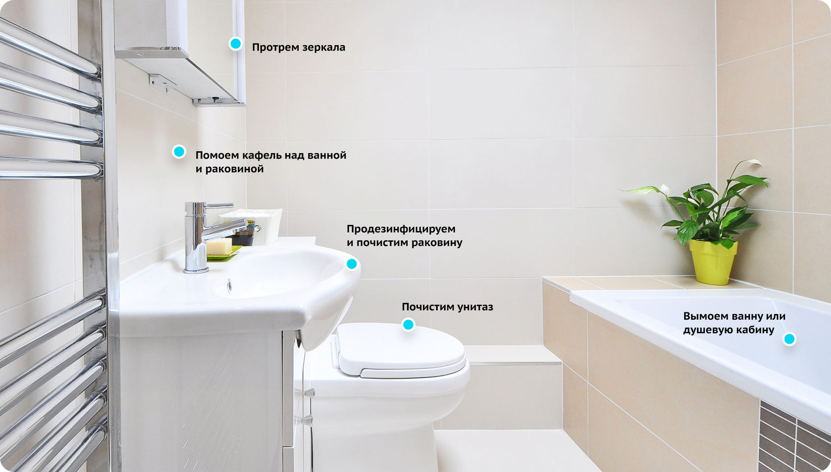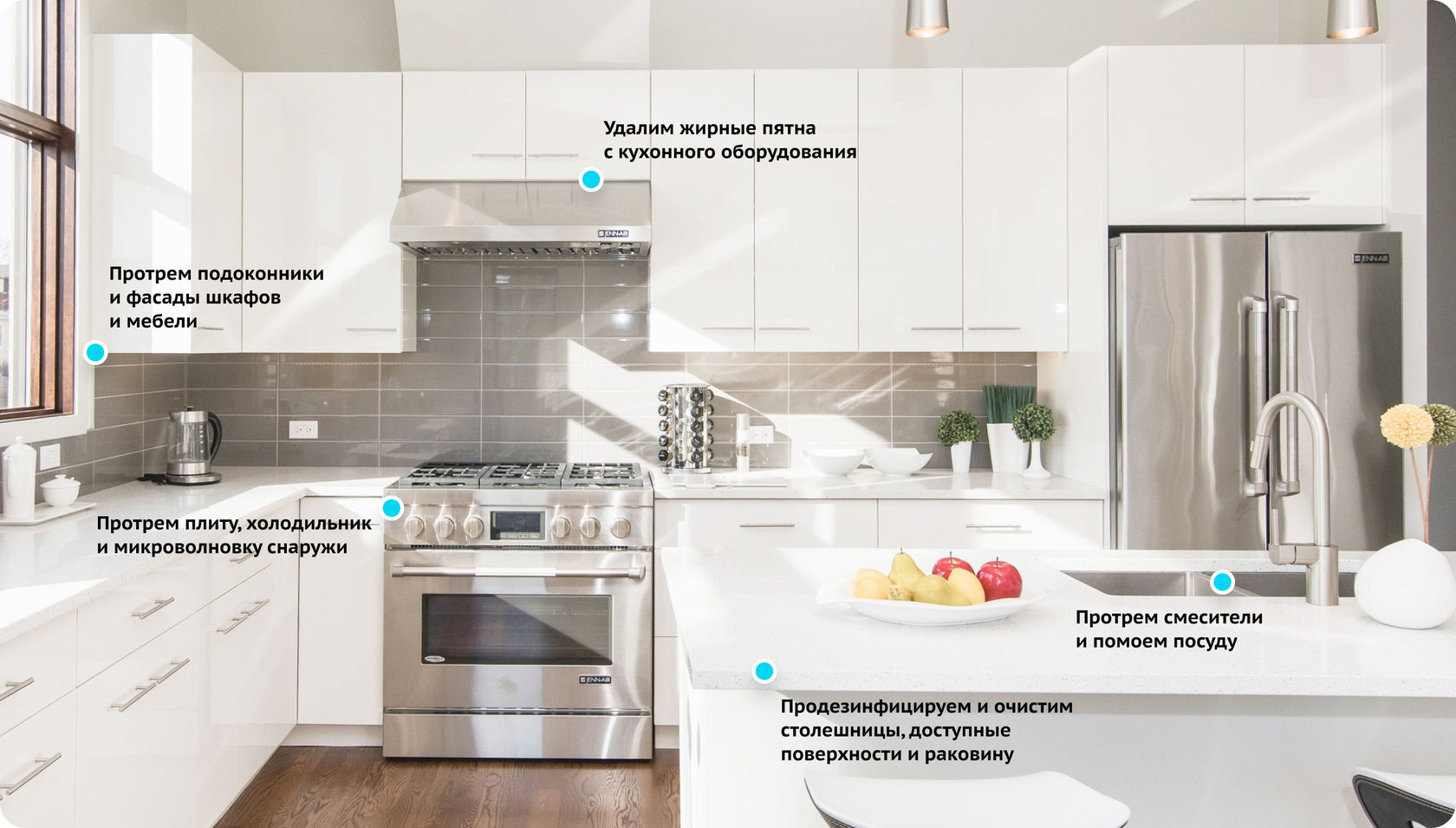 Мы проводим генеральную уборку. В неё входит чек-лист из 40 пунктов. В дополнение к базовой уборке отмываем все сильные загрязнения, удаляем пыль с антресолей и карнизов, на кухне моем всю бытовую технику внутри и кухонные шкафчики снаружи, в ванной — все стены.